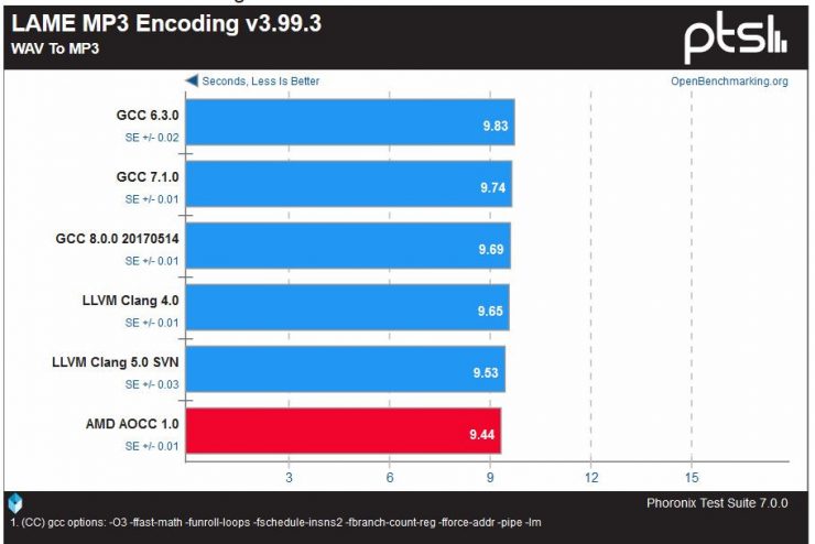 En el análisis de rendimiento, se enfrenta AOCC a otros compiladores tradicionales: GCC y LLVM Clang en distintas versiones. Utilizan un procesador AMD Ryzen 7 1700 de 8 núcleos y 16 hilos en el sistema operativo Linux Ubuntu 17.04. Seguidamente aparecen las imágenes con el resultado del análisis. En las pruebas, se ve como el rendimiento de AOCC supera en la mayoría de casos al de GCC, pero solo en algunos es mejor que del LLVM Clang. Por ejemplo refleja casos donde queda por debajo de compiladores como LLVM Clang 5.0.