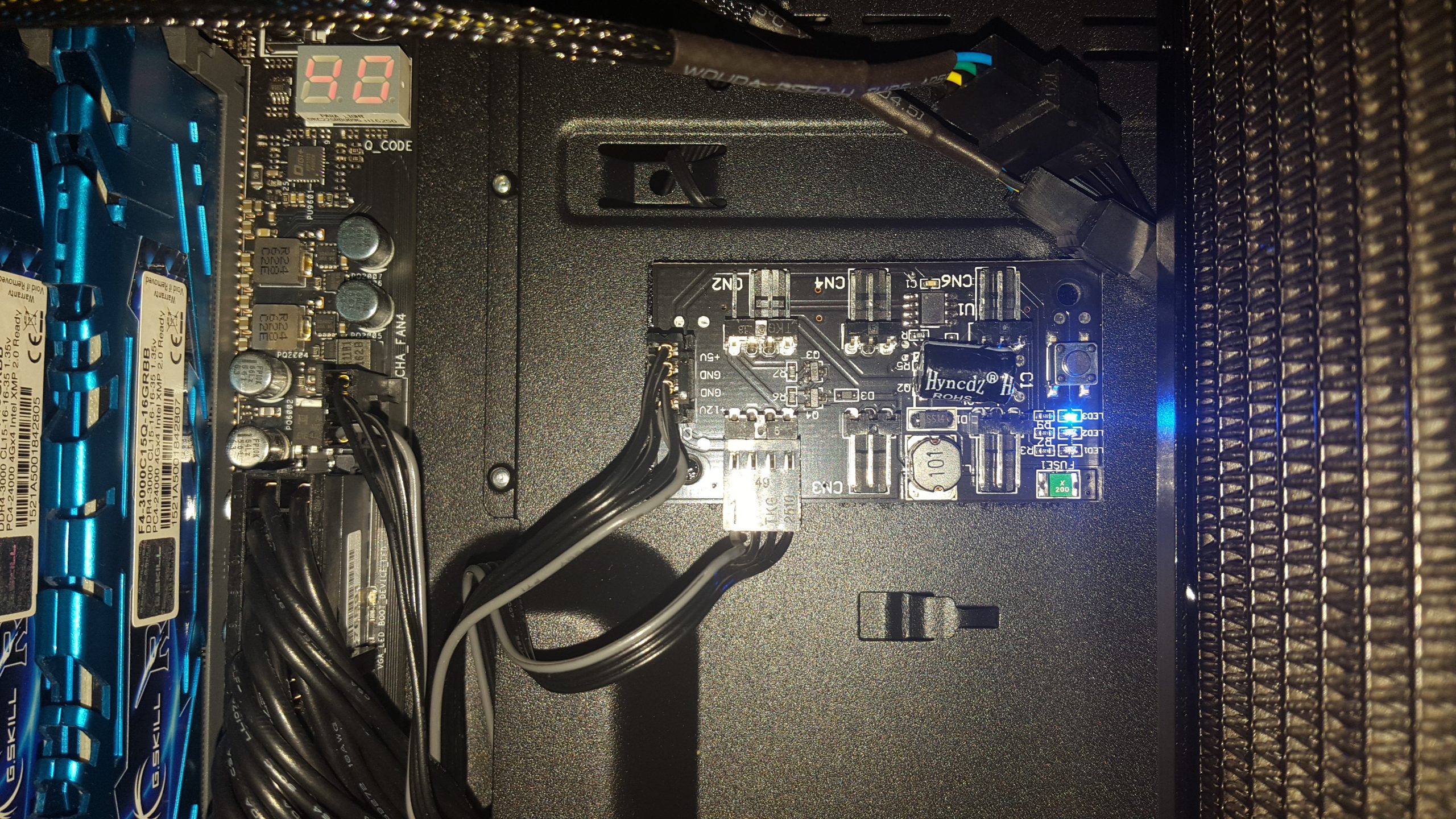 Con un poco de maña podremos conseguir ordenar todo el maremágnum de cables resultante y que se complica por encima del resto de cajas con los conectores adicionales incluidos para la iluminación frontal y para las 2 tiras led, las cuales deberemos comprar por nuestra cuenta. Otro cable añadido vendrá de la mano de una pequeña placa rehobus que colocaremos mediante adhesivo al interior de la caja y que nos permitirá conectar 4 ventiladores de 3 pines y uno de 4 pines, decidiendo mediante un pequeño botón si queremos que los controle la placa mediante PWM o que permanezcan siempre al 60 o al 100 % de su velocidad. Así queda la parte posterior de la Aerocool P7-C1 cuando ya hemos organizado todo el cableado: