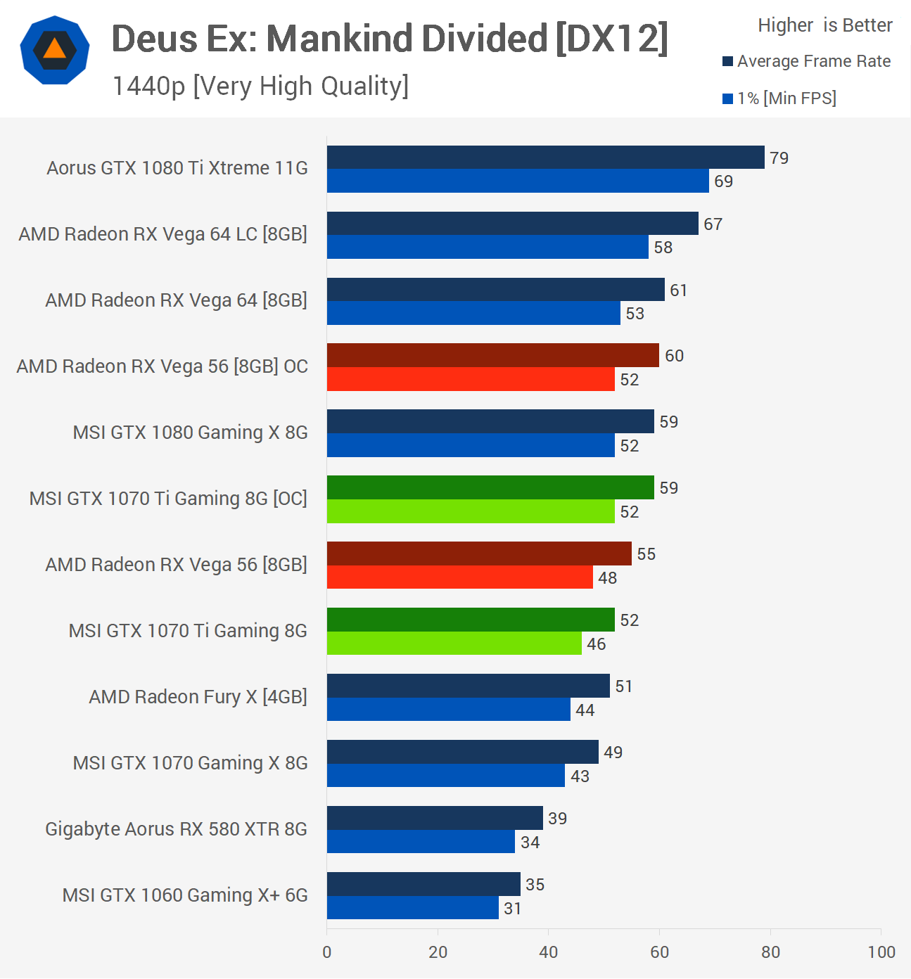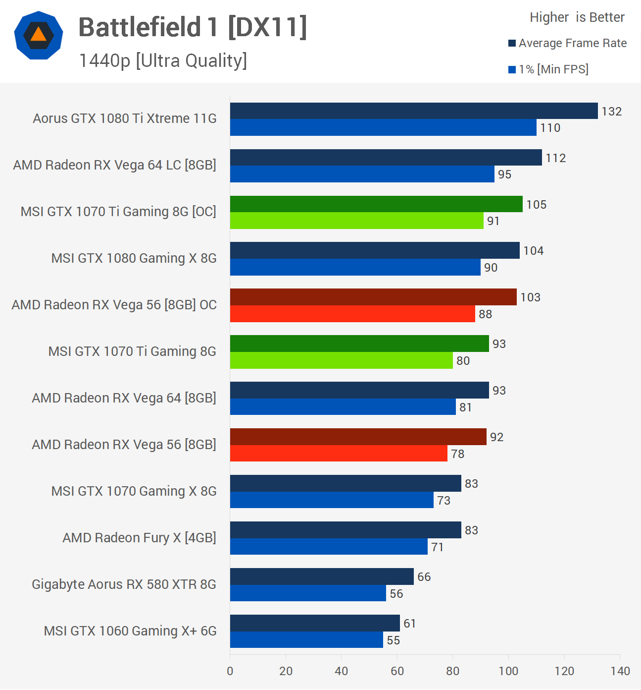 En los siguientes cuadros, se puede comprobar como las GeForce GTX 1070 Ti se desenvuelven notablemente frente a modelos bastante más caros. Estos datos han sido extraídos del análisis realizado en techspot, aplicando overclock a la tarjeta.