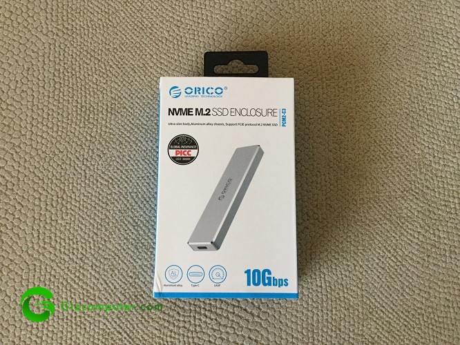 La carcasa ORICO M.2 NVMe SSD se presenta en una caja rígida de plástico cubierta con una funda de cartón